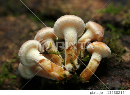 一朵小巧、多毛、劇毒的幼年松茸(天然蘑菇的微距照片)