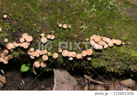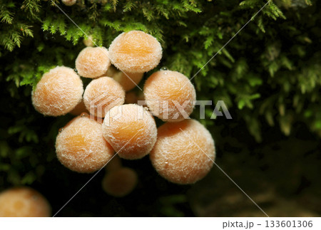 生長在長滿苔蘚的枯樹幹上的小型幼嫩香菇(天然蘑菇的微距攝影)