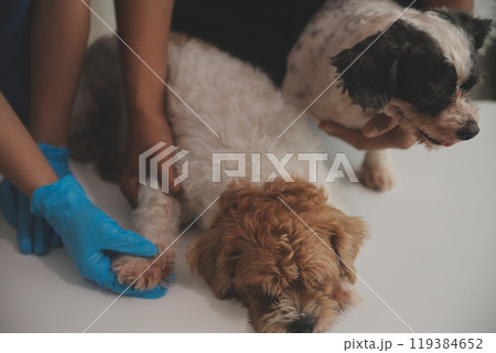 At a modern veterinary clinic, a Panshi Tzu puppy sits on an examination table. Meanwhile, a female veterinarian