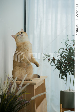 happy with cat concept with british cat play on wood table with modern home decoration background