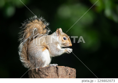 Squirrel in autumn hides nuts on the green grass with fallen yellow leaves