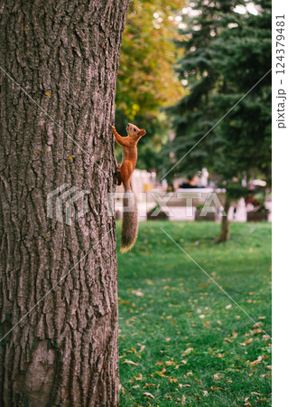 Beautiful red squirrel climbs a tree in a green park