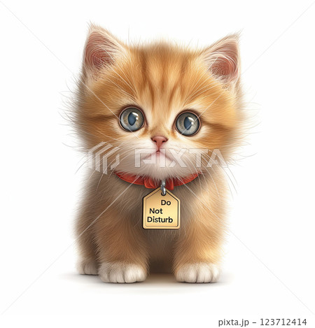 cute orange kitten with big eyes and Do Not Disturb tag, looking playful