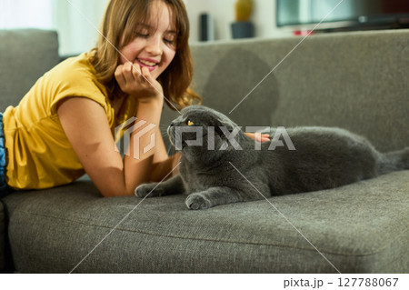 Teen girl interacts with a playful Scottish Fold cat at home on a cozy couch during the afternoon
