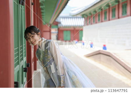 灰色背景辦公大樓裡微笑的年輕亞洲女商人