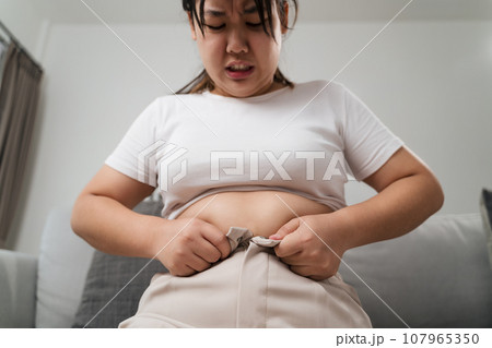 Fat chubby woman trying to wear tight pants, overweight, weight gain, Healthy and medical concept.