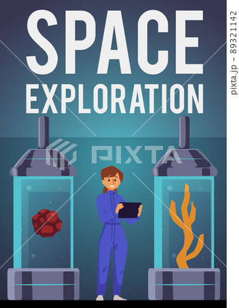 Space exploration poster template, astronaut or scientist woman studying alien plants, flat vector illustration.