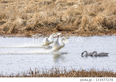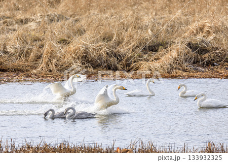 一群天鵝降落在北海道千歲市的水面上 [11月]