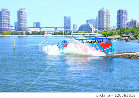 東京港區台場,水陸兩用巴士墜入水中的場景