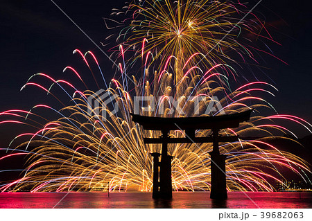 宇城市不知火町,長尾劍神社,鳥居周圍燃放水上煙火的風景