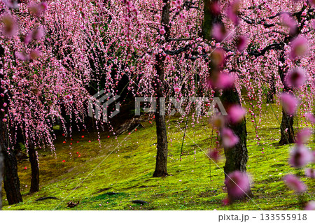 喬南古神社的垂梅樹下著雨。