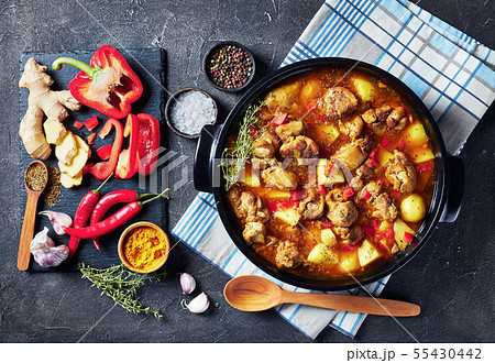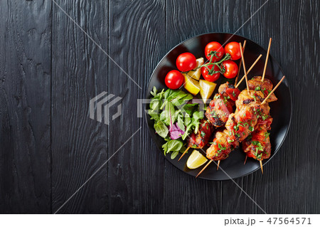 Three slice of baked pork on the bed of corn mashdecorated with celera and green onion.White plate.Knife and fork.Colour stripe cloth.Dark wooden background.