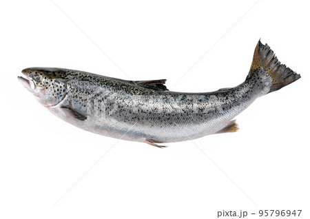 Whole uncut salmon carcass on white background. photos for markets, shops and restaurants. carcass of atlantic salmon