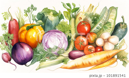 Vegetables set with cabbage chili lettuce garlic tomato eggplant cucumber and bell pepper. Watercolor fresh organic kitchen design