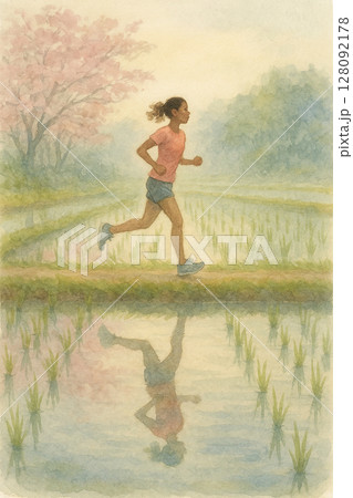 春天在稻田路上奔跑的女孩 | 水彩風格跑步插圖 春天在稻田路上奔跑的女孩 | 水彩風格跑步風景