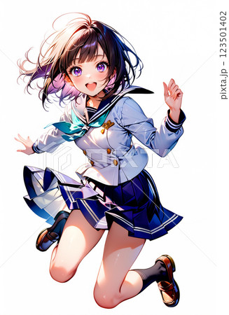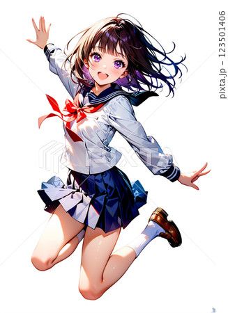 白色背景。身穿水手服、綁著馬尾的女高中生