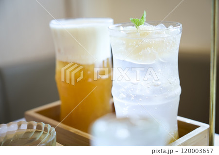 Refreshing summer drinks with ice and fruit in fancy glasses