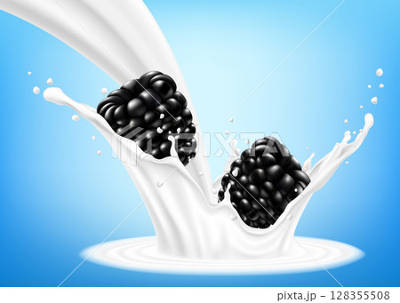 Fresh blackberry in a splash of milk or yogurt. Fresh berry falls into the milk. 3d realistic vector illustration, isolated on blue background. Sweet food. Organic fruit.