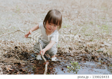 在水坑裡玩耍的小女孩