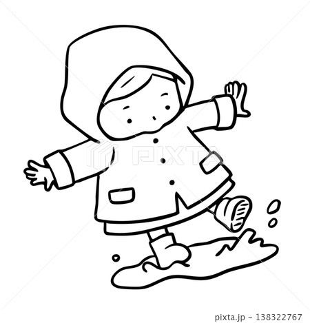 一個穿著雨衣的女孩在水坑裡玩耍(線條畫)