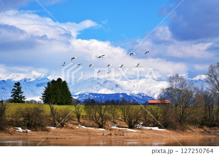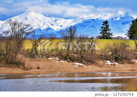 北海道美瑛的水澤水壩和十勝山脈的壯麗景色
