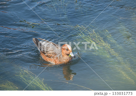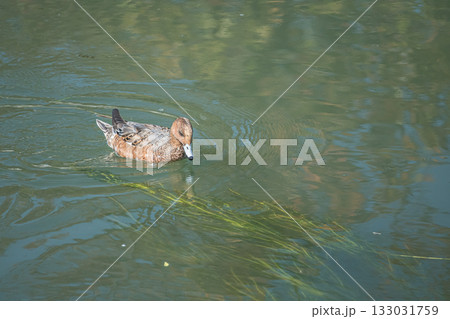 一隻雌性赤頸鴨正在京都市琵琶湖運河邊吃水生植物