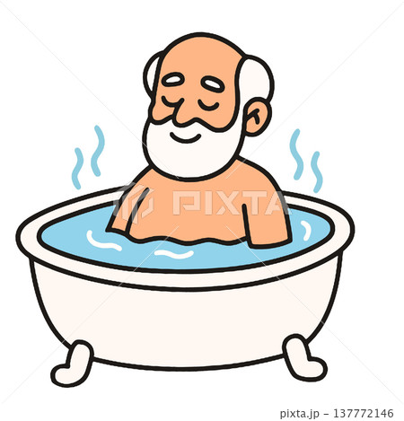 Elderly man bathtub relaxing steam cartoon happy beard white hair water hygiene