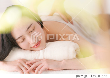 A young Asian woman with a perfect face poses, touching her shoulders with her eyes closed.
