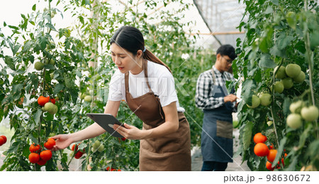 Asian couple of farmers inspects plants with a digital tablet In a greenhouse plantation.