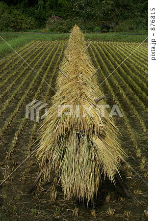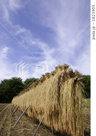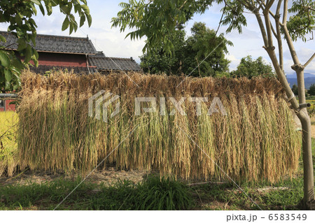 收割後的稻穀掛在架上的場景