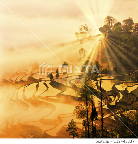 [新潟縣] 秋季的星峠和梯田,黎明時分的霧氣