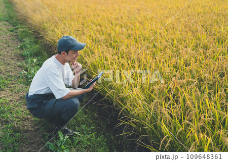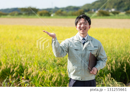 水稻收割圖片:一個年輕人看著水稻的後視圖