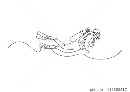 Continuous one line drawing scuba diver is floating underwater with tank and fins, gliding effortlessly in horizontal position, fluid exploration. Single line draw design vector graphic illustration