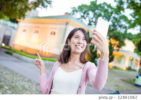 Woman taking selfie by mobile phone in Taipa of Macau city