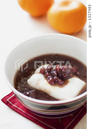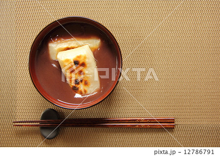 朱紅色的碗裡盛有日本甜善哉、白子、紅豆和甜點。