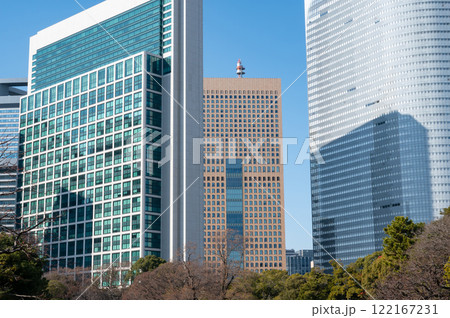 日本東京的城市景觀 Shiodome 的商業區,冬季晴朗的藍天。後面可以看到新幹線和麻布台山...