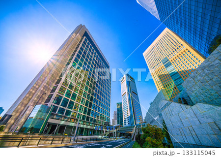 日本東京城市景觀,俯瞰沐浴在早晨陽光下的汐留辦公區。後面的麻布台...邁向新時代 = 9th