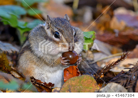 蝦夷花栗鼠在落葉中舔手