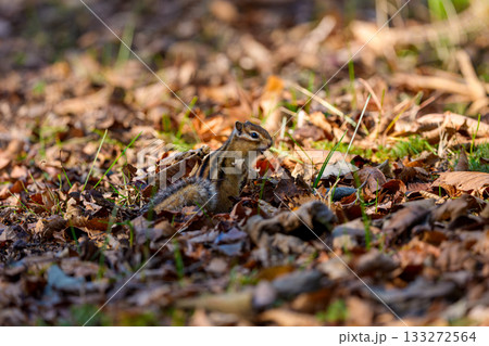 一隻北海道花栗鼠在落葉上覓食