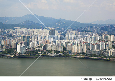 在首爾北部夢幻森林的楓樹下看到遠處的山間公寓大樓