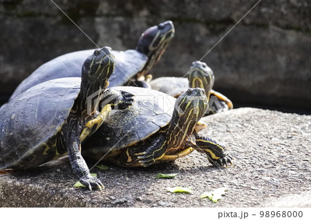 紅耳龜(綠海龜)在岩石上曬甲殼