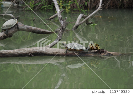 水邊的紅耳龜和綠海龜