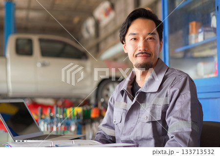 Portrait Asian Japanese male mechanic worker portrait in auto service workshop car maintenance center replace fix auto engine part