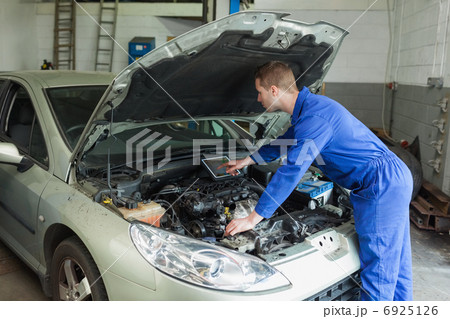 Portrait of caucasian mechanic checking the safety of a car. Maintenance of damaged parts in the garage. Maintenance repairs. Repair service concept. Portrait of a car mechanic working in a workshop.