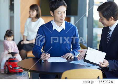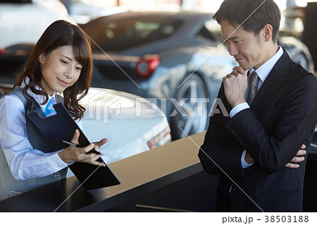 一位年輕的亞裔男性推銷員為一對前來採購、估價、購買汽車的夫婦服務。