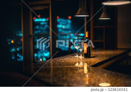 酒吧櫃檯上的葡萄酒和酒杯,可欣賞夜景