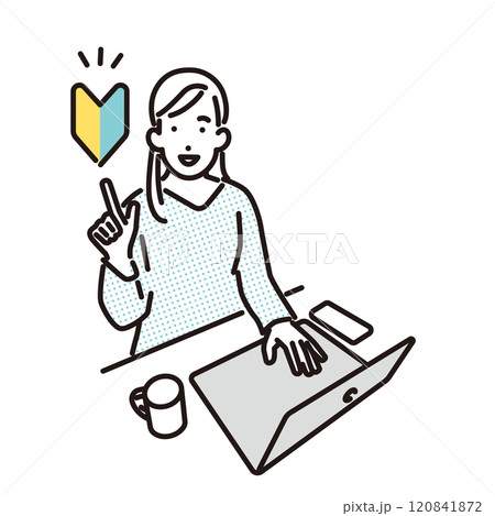 一名年輕女子指著初學者標記和一台筆記型電腦的簡單插圖