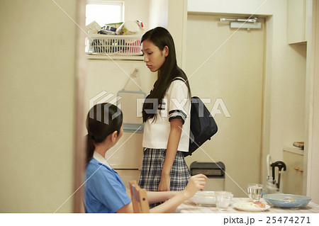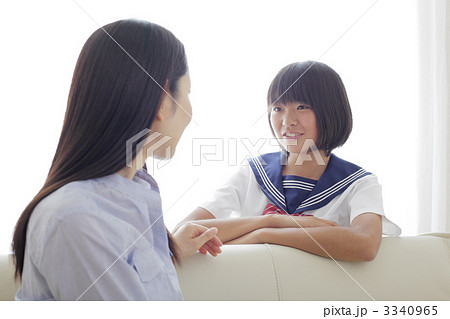 一個女人,父母和孩子,母女,國中生,老師,老師,在公園的長椅上微笑著說話