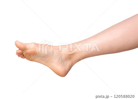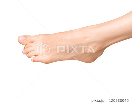 Barefoot foot, tensed sole visible from the side. Smooth, healthy skin in a feminine pose,