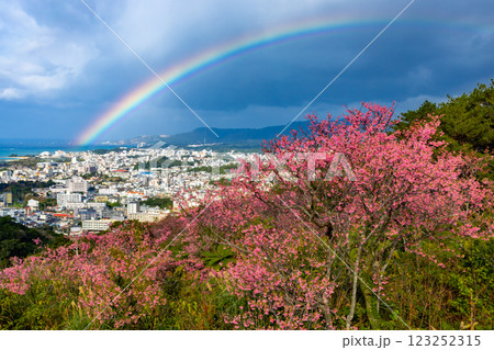 沖繩縣名護市名護城公園櫻花園中早開的琉球冬櫻花,下方是名護鎮上空的彩虹